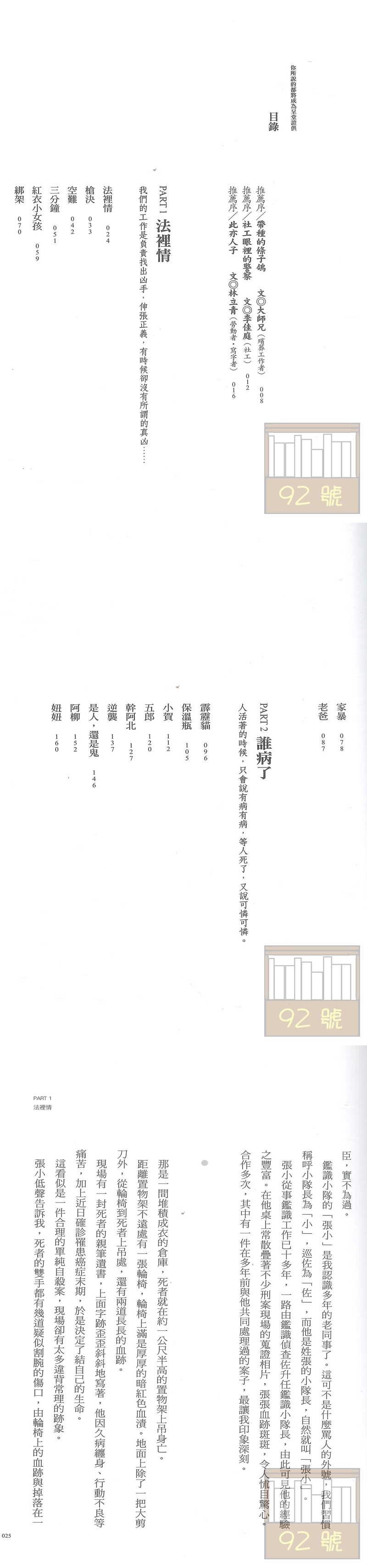 推薦序帶種的條子鴿 文 大師兄殯葬工作者 008 推薦序社工眼裡的警察. 你所說的都將成為呈堂證供 條子鴿 本集重點 好警察有三不 --- 0154 我們所不了解的警察故事 --- 0248 刑場和你想的不一樣 帶你直.