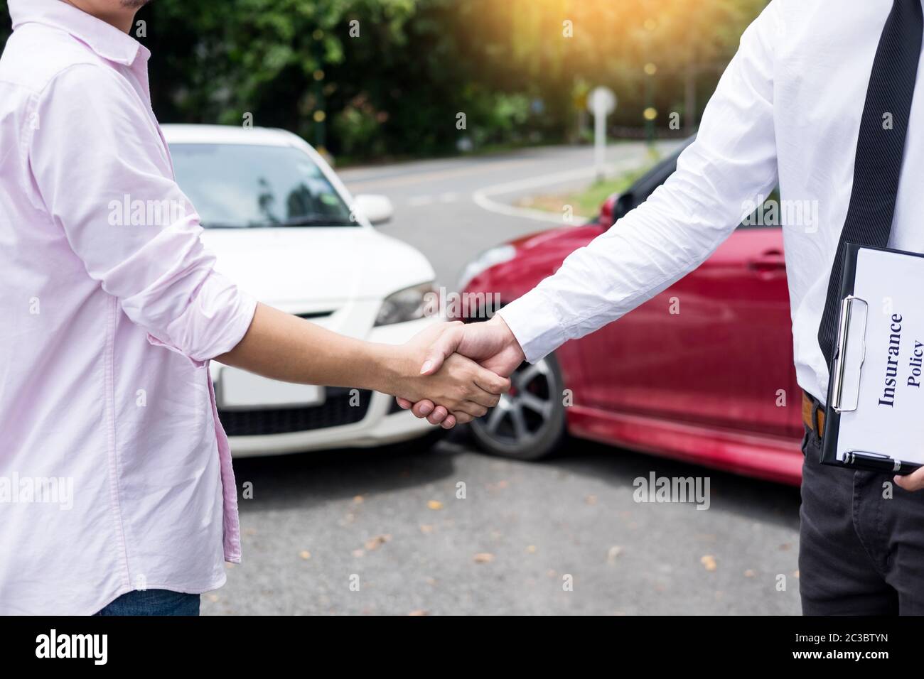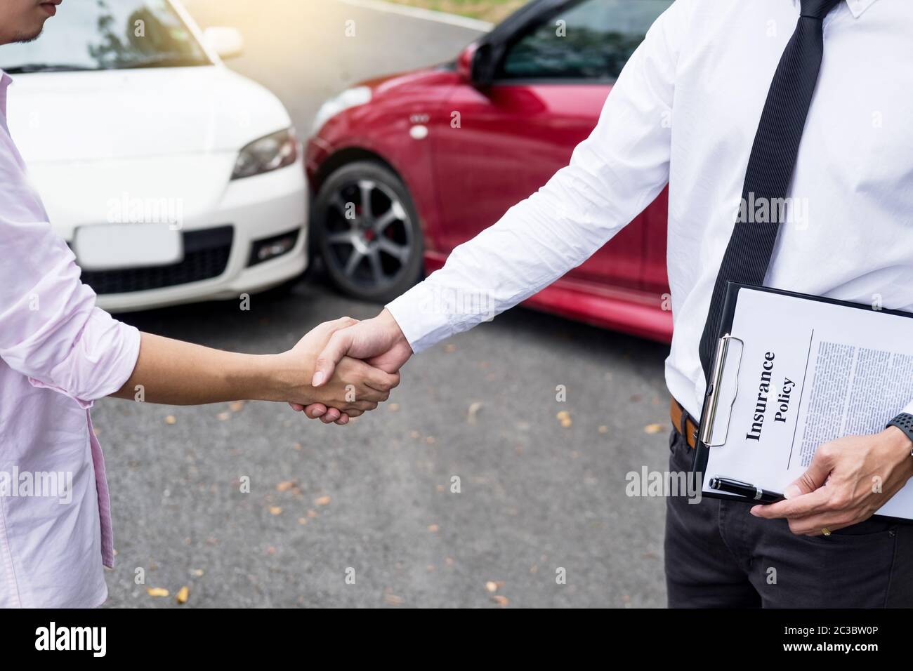 Customer Shake Hand With Auto Insurance Agents Examining Car Crash Owner After Agreeing Find A Friendly Agreement After A Car Accident To Terms Of Ins Stock Photo Alamy